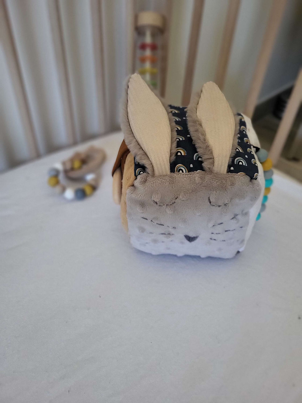 Je vous propose également des couvertures, des bavoirs bandanas, des doudous, des attaches sucettes, des anneaux de dentitions, des cubes d'éveil, des capes de bain, des trousses de toilettes, des éponges, des lingettes, de l'essui tout cousu par mes soins.